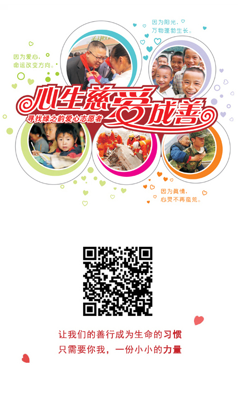 自2012年5月20日起,填寫“綠之韻愛心認(rèn)捐書”參與“每天ー元錢”愛心捐贈(大于或等于365元),傳真至公司業(yè)務(wù)服務(wù)部,完成志愿者申請,即獲贈由公司統(tǒng)一制作的“綠之韻愛心志愿者T恤”及“愛心徽章”。