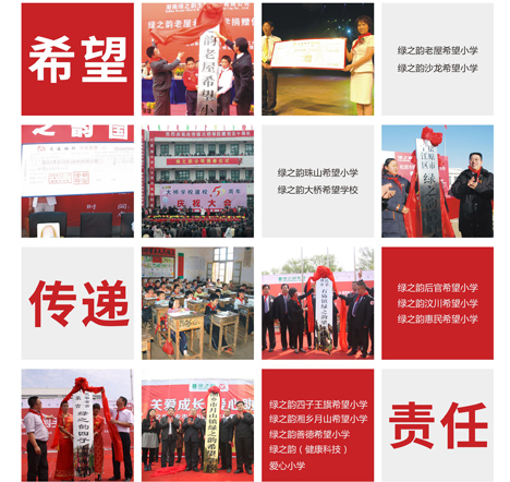 【具體內(nèi)容】:捐助38所綠之韻希望學校是所有綠之韻人的夙愿。全國各地已先后有綠之韻沙龍希望小學、綠之韻珠山希望小學、綠之韻大橋希望學校、綠之韻后官希望小學誕生、綠之韻汶川希望小學、綠之韻惠民希望小學、綠之韻四子王旗希望小學、綠之韻湘鄉(xiāng)月山希望學校、綠之韻(健康科技)涼山愛心小學等。2014年11月25日,綠之韻集團獲共青團中央、中國青少年發(fā)展基金會“希望工程25周年杰出貢獻獎”。