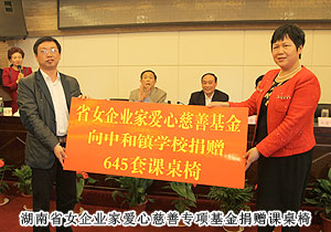 會議現(xiàn)場,省工商聯(lián)扶貧處處長甘露與省工商聯(lián)女企業(yè)家商會會長吳建平簽署協(xié)議,成立了湖南省光彩事業(yè)基金會女企業(yè)家愛心慈善專項基金,并向瀏陽市中和鎮(zhèn)學校捐贈645套課桌椅。