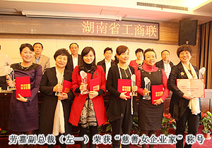 2013年3月27日,湖南省工商聯(lián)女企業(yè)家商會四屆三次理事會暨2012年度“慈善女企業(yè)家”表彰會在長沙召開。一大批優(yōu)秀團體會員和優(yōu)秀個人會員受到表彰,湖南省工商聯(lián)(總商會)女商會副會長、綠之韻集團董事常務副總裁勞嘉榮獲“慈善女企業(yè)家”榮譽稱號。同時,會上成立了湖南省光彩事業(yè)基金會女企業(yè)家愛心慈善專項基金。湖南省副省長、省工商聯(lián)主席何報翔,湖南省人大常委會原副主任顏永盛,中共湖南省委統(tǒng)戰(zhàn)部副部長、省工商聯(lián)黨組書記、省非公經(jīng)濟組織黨工委書記湯新華,省工商聯(lián)副主席史雪華等領導出席會議,并為獲獎代表頒獎。