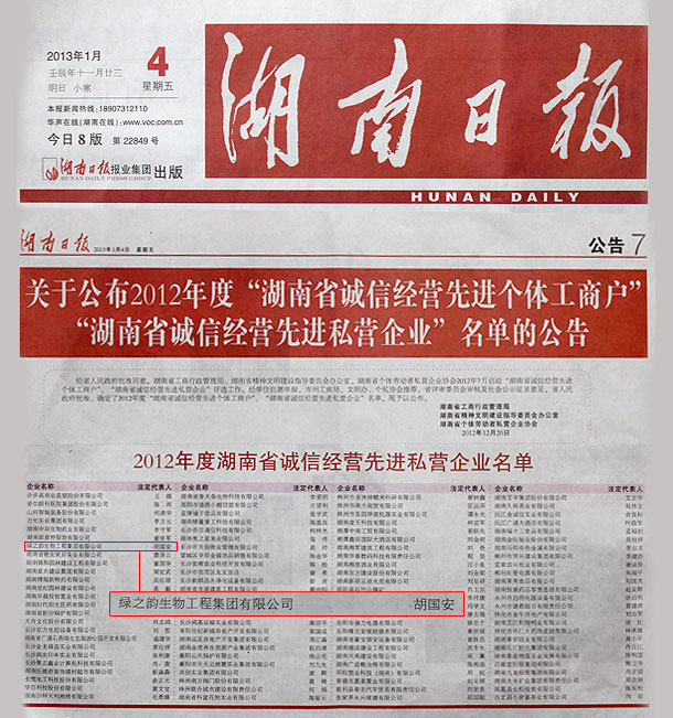 2013年1月4日上午,湖南省工商行政管理局、湖南省精神文明建設指導委員會辦公室、湖南省個體勞動者私營企業(yè)協(xié)會聯(lián)合召開新聞通報會,公布“2012年度湖南省誠信經(jīng)營先進個體工商戶”和“2012年度湖南省誠信經(jīng)營先進私營企業(yè)”名單。湖南省工商局黨組書記、局長李金冬出席會議并通報評選活動開展情況;省文明辦副主任周孟霞宣讀誠信經(jīng)營先進個體工商戶名單;省工商局總會計師、省個私協(xié)會常務副會長、評審委員會主任張其術宣讀誠信經(jīng)營先進私營企業(yè)名單。會議由省工商局黨組副書記、副局長寇勇主持。綠之韻集團董事、常務副總裁勞嘉等先進誠信經(jīng)營單位代表以及省工商局有關部門負責人參加通報會。