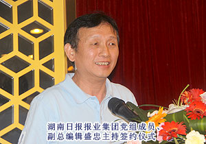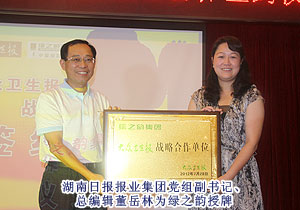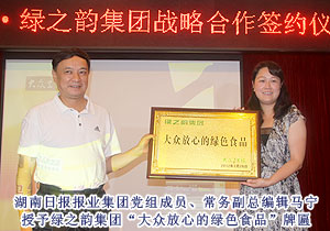 簽約儀式由湖南日?qǐng)?bào)報(bào)業(yè)集團(tuán)黨組成員、副總編輯盛忠主持。會(huì)上,湖南日?qǐng)?bào)報(bào)業(yè)集團(tuán)黨組副書記、總編輯董岳林為綠之韻集團(tuán)授予“大眾衛(wèi)生報(bào)?綠之韻集團(tuán)戰(zhàn)略合作單位”牌匾。湖南日?qǐng)?bào)報(bào)業(yè)集團(tuán)黨組成員、常務(wù)副總編輯馬寧授予綠之韻集團(tuán)“大眾放心的綠色食品”牌匾,綠之韻集團(tuán)董事常務(wù)副總裁勞嘉代表集團(tuán)接受牌匾。
