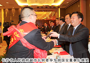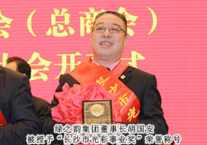 2011年12月23日,長(zhǎng)沙市工商聯(lián)(總商會(huì))第十三次會(huì)員代表大會(huì)在長(zhǎng)沙隆重召開(kāi)。中共湖南省委常委、長(zhǎng)沙市委書(shū)記陳潤(rùn)兒,中共長(zhǎng)沙市委副書(shū)記、市長(zhǎng)張劍飛,中共長(zhǎng)沙市委常委、市委統(tǒng)戰(zhàn)部部長(zhǎng)文樹(shù)勛,湖南省委統(tǒng)戰(zhàn)部副部長(zhǎng)、省工商聯(lián)黨組書(shū)記崔永平等省市各級(jí)領(lǐng)導(dǎo)出席會(huì)議。作為長(zhǎng)沙市工商聯(lián)(總商會(huì))副主席,綠之韻集團(tuán)董事長(zhǎng)胡國(guó)安憑借多年來(lái)率領(lǐng)企業(yè)積極響應(yīng)并參與 “萬(wàn)企聯(lián)村、共同發(fā)展”、情系“三區(qū)”,感恩社會(huì)光彩大行動(dòng)等活動(dòng)取得的成績(jī),榮獲由長(zhǎng)沙市委統(tǒng)戰(zhàn)部、市工商聯(lián)聯(lián)合頒發(fā)的“長(zhǎng)沙市光彩事業(yè)獎(jiǎng)”。