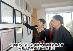 2011年11月23日,長(zhǎng)沙市委統(tǒng)戰(zhàn)部常務(wù)副部長(zhǎng)劉映群,市委督辦專員、市委統(tǒng)戰(zhàn)部調(diào)研員吳忠祥一行蒞臨綠之韻集團(tuán)考察調(diào)研,就綠之韻“萬(wàn)企聯(lián)村,共同發(fā)展”省級(jí)優(yōu)秀示范項(xiàng)目建設(shè)進(jìn)行工作指導(dǎo),綠之韻集團(tuán)董事長(zhǎng)胡國(guó)安、董事常務(wù)副總裁勞嘉陪同考察。