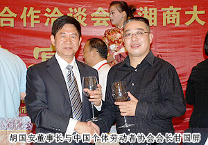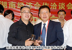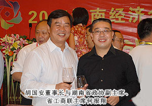 2011年9月28日,2011湖南省經(jīng)濟(jì)合作洽談會(huì)暨湘商大會(huì)在衡陽(yáng)隆重召開(kāi),來(lái)自國(guó)內(nèi)23個(gè)省的54個(gè)代表團(tuán)、42家各地商會(huì)的3000余名代表共赴盛會(huì)。全國(guó)政協(xié)原副主席毛致用、中共湖南省委常委、常務(wù)副省長(zhǎng)于來(lái)山、國(guó)家工商總局副局長(zhǎng)鐘攸平,中國(guó)個(gè)體勞動(dòng)者協(xié)會(huì)會(huì)長(zhǎng)甘國(guó)屏、湖南省政協(xié)副主席、省工商聯(lián)主席何報(bào)翔等各級(jí)領(lǐng)導(dǎo)出席開(kāi)幕式。應(yīng)湖南省工商聯(lián)、衡陽(yáng)市人民政府的邀請(qǐng),中國(guó)青年企業(yè)家協(xié)會(huì)常務(wù)理事、湖南省青年企業(yè)家協(xié)會(huì)副會(huì)長(zhǎng)、2009中國(guó)十大杰出湘商、綠之韻集團(tuán)董事長(zhǎng)胡國(guó)安出席大會(huì)。