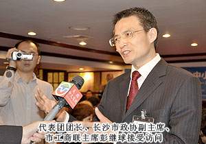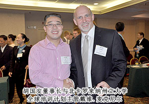 美國(guó)當(dāng)?shù)貢r(shí)間2011年9月20日上午,“長(zhǎng)沙——美國(guó)中小企業(yè)合作周”商貿(mào)對(duì)接會(huì)在美國(guó)北卡羅來(lái)納州隆重舉行。在長(zhǎng)沙市人民政府的組織下,來(lái)自各行各業(yè)的民營(yíng)企業(yè)家在長(zhǎng)沙市政協(xié)副主席、市工商聯(lián)主席彭繼球的帶領(lǐng)下,赴美參加為期12天的合作周考察活動(dòng)。長(zhǎng)沙市工商聯(lián)(總商會(huì))副主席、綠之韻集團(tuán)董事長(zhǎng)胡國(guó)安應(yīng)邀赴美考察。