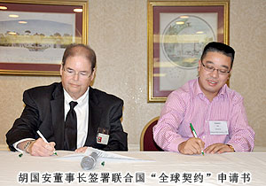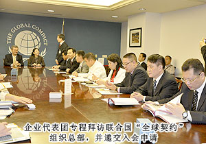 考察過(guò)程中,企業(yè)家代表團(tuán)一行專(zhuān)程拜訪(fǎng)了聯(lián)合國(guó)“全球契約”組織總部,與聯(lián)合國(guó)“全球契約”總干事喬治?科爾進(jìn)行了友好、親切的會(huì)見(jiàn)。綠之韻集團(tuán)、楚天科技、佳樂(lè)實(shí)業(yè)等湖南省15家民營(yíng)企業(yè)現(xiàn)場(chǎng)向該組織遞交了入會(huì)申請(qǐng)。“全球契約”是一種思路和價(jià)值觀(guān),由前聯(lián)合國(guó)秘書(shū)長(zhǎng)安南首倡議,潘基文秘書(shū)長(zhǎng)繼續(xù)推動(dòng)。該契約旨在鼓勵(lì)全球企業(yè)與聯(lián)合國(guó)機(jī)構(gòu)、勞工組織和民間團(tuán)體一起,共同尋找克服全球化負(fù)面影響的途徑。加入該組織的單位必須在遵守人權(quán)、勞動(dòng)標(biāo)準(zhǔn)、環(huán)境保護(hù)等方面率先垂范。