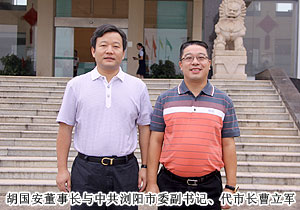 2011年9月8日上午,為更好地指導(dǎo)綠之韻集團(tuán)“萬(wàn)企聯(lián)村,共同發(fā)展——湖南益陽(yáng)萬(wàn)畝中藥材種植基地”省級(jí)優(yōu)秀示范項(xiàng)目建設(shè),湖南省政協(xié)副主席、省工商聯(lián)主席何報(bào)翔在長(zhǎng)沙市政協(xié)副主席、長(zhǎng)沙市工商聯(lián)主席彭繼球,中共瀏陽(yáng)市委副書記、代市長(zhǎng)曹立軍等陪同下,蒞臨綠之韻集團(tuán)考察調(diào)研。同日下午,繼上次陪同何報(bào)翔主席前往郴州宜章考察縣域經(jīng)濟(jì)的發(fā)展,湖南省工商聯(lián)常委、綠之韻集團(tuán)董事長(zhǎng)胡國(guó)安再次陪同何報(bào)翔主席前往瀏陽(yáng)調(diào)研非公經(jīng)濟(jì)發(fā)展。