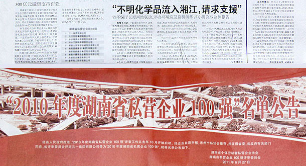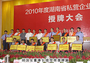 2011年8月16日,湖南省私營企業(yè)100強(qiáng)授牌大會(huì)在長沙隆重舉行。中共湖南省委副書記、省長徐守盛、中國個(gè)體勞動(dòng)者協(xié)會(huì)會(huì)長甘國屏、省人民政府副省長劉力偉、湖南省人大常委會(huì)副主任陳叔紅、湖南省政協(xié)副主席、省工商聯(lián)會(huì)長何報(bào)翔等省市領(lǐng)導(dǎo)出席頒獎(jiǎng)儀式。綠之韻集團(tuán)作為湖南省重點(diǎn)企業(yè),榮耀晉升“2010年度湖南省私營企業(yè)100強(qiáng)”行列,胡國安董事長應(yīng)邀出席頒獎(jiǎng)儀式,得到了省市各級(jí)領(lǐng)導(dǎo)的肯定和贊許。