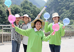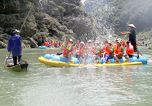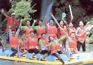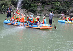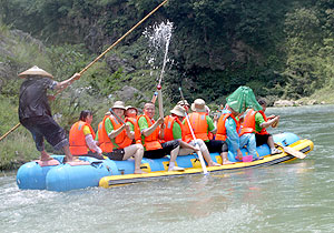 在胡國(guó)安董事長(zhǎng)的率領(lǐng)下,伙伴們浩浩蕩蕩前往素有“天下第一漂”美譽(yù)的猛洞河漂流。大家搶購(gòu)著水槍、水瓢、雨衣等打水仗的武器,懷著渴望刺激挑戰(zhàn)驚險(xiǎn)的心情互相挑釁,只見(jiàn)河中水花飛舞、水柱橫飛,還未等上船伙伴們就紛紛“濕身”了。拐一百五十五個(gè)彎,在一百三十三個(gè)灘潭中穿梭而行,兩岸怪石嶙峋,野猴出沒(méi),飛瀑激流,山與水的組合,讓許多來(lái)自北方的營(yíng)銷(xiāo)精英大呼過(guò)癮。來(lái)自葫蘆島的65歲的韓秀芝老太,端著水槍?zhuān)罩埃c伙伴們暢快淋漓地酣戰(zhàn),她說(shuō):真是太過(guò)癮了,人生難得有幾回這樣的機(jī)會(huì),我一定要帶領(lǐng)更多的伙伴來(lái)挑戰(zhàn)猛洞河!