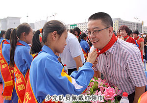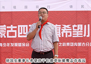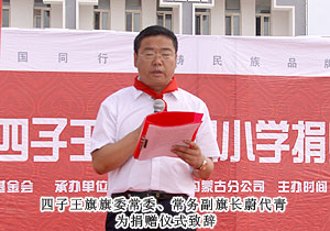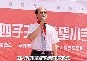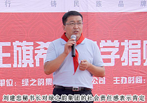 捐贈儀式現(xiàn)場,上百名綠之韻愛心精英共舞《中國人》,昂揚(yáng)的氣勢,莊嚴(yán)的氛圍震撼全場。因為同是中國人,同在藍(lán)天下,所以我們更要像孟子所希望的一樣“老吾老以及人之老,幼吾幼以及人之幼”,奉獻(xiàn)自己力所能及的愛心,為社會輸送溫暖,讓感動在每一個人的心中升溫。少先隊員為蒞臨現(xiàn)場的領(lǐng)導(dǎo)和嘉賓敬獻(xiàn)紅領(lǐng)巾,那一抹鮮紅代表著光榮,代表著感恩,它在每一位愛心人士的胸前飄揚(yáng),讓綠之韻人的責(zé)任更加重大。四子王旗常委、常務(wù)副旗長蔚代青致歡迎辭,對綠之韻集團(tuán)的大愛無疆表示誠摯的謝意和肯定。胡國安董事長發(fā)言,他表示:教育是立國之本,作為優(yōu)秀的企業(yè)公民,綠之韻始終堅持“企業(yè)做大了就是屬于國家、屬于社會的”這一社會責(zé)任理念,為捐建38所綠之韻希望小學(xué)的目標(biāo)堅持不懈。草原是雄鷹的故鄉(xiāng),作為同樣從大山里走出來的孩子,胡國安董事長深深知道每一個孩子心中的夢想,希望孩子們能像鷹一樣,在學(xué)習(xí)中志存高遠(yuǎn),鷹擊長空。