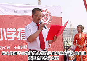 2011年7月20日,位于內(nèi)蒙古自治區(qū)烏蘭察布市的四子王旗熱鬧非凡--綠之韻四子王旗希望小學(xué)在此舉行隆重的捐贈儀式。內(nèi)蒙古自治區(qū)青少年發(fā)展基金會秘書長劉建忠、四子王旗旗委、常務(wù)副旗長蔚代青、政協(xié)副主席于有升、四子王旗工商局局長董明、副局長賈晉峰等政府領(lǐng)導(dǎo)及各界媒體嘉賓蒞臨,綠之韻集團(tuán)董事長胡國安、執(zhí)行總經(jīng)理龔振、綠之韻慈善基金總執(zhí)行戴曉彥不遠(yuǎn)萬里趕赴捐贈現(xiàn)場,內(nèi)蒙古分公司經(jīng)理候立新、內(nèi)蒙古地區(qū)愛心大使代表王連坤、郝建兵、張聞英以及2000余名綠之韻愛心大使參與愛心傳遞。