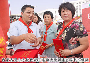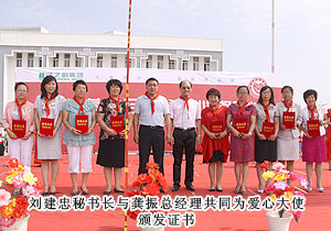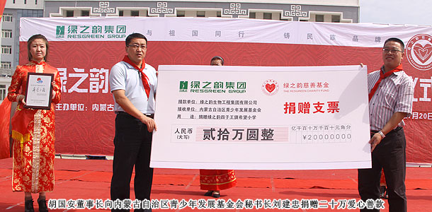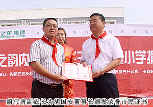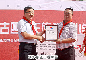胡國安董事長向內(nèi)蒙古自治區(qū)青基會秘書長劉建忠遞交二十萬捐贈支票,并接受希望工程牌匾。劉建忠秘書長發(fā)表講話,向勇于承擔(dān)社會責(zé)任的綠之韻集團(tuán)和全體營銷精英致上誠摯敬意。四子王旗常委、常務(wù)副旗長蔚代青與胡國安董事長共同為希望小學(xué)揭牌,并向胡國安董事長頒發(fā)榮譽(yù)市民證書。青基會秘書長劉建忠和執(zhí)行總經(jīng)理龔振給愛心經(jīng)銷商頒發(fā)證書,整個活動現(xiàn)場人潮洶涌,彌漫著感恩與關(guān)愛,孩子們精彩的節(jié)目表演將揭牌儀式活動推向了高潮,現(xiàn)場所有精英心懷感動,愿意盡自己的能力獻(xiàn)出更多關(guān)愛和溫暖。龔總在致辭中說:在綠之韻八年的發(fā)展中,綠之韻慈善基金在教育、幫扶、救災(zāi)、助學(xué)等方面作出的公益事業(yè)投入累計已近2000萬元,是每一位愛心綠之韻精英的點滴匯聚才有了公司萬涓成海的善舉。