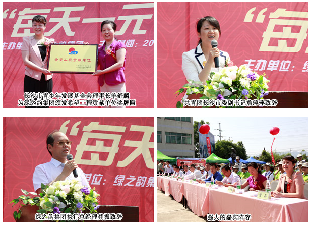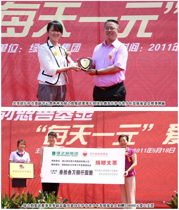 感恩五月,綠之韻人用實際行動再一次傳遞愛心。2011年5月18日,綠之韻集團“激情五月 夢想嘉年華”活動現(xiàn)場,綠之韻慈善基金“每天一元”的慈善倡議活動得到了社會各界、集團領(lǐng)導(dǎo)、綠之韻員工、經(jīng)銷商的熱情參與。共青團長沙市委副書記詹萍萍、長沙市青少年發(fā)展基會理事長羊舒麟、長沙國家生物產(chǎn)業(yè)基地管委會副主任陳志高、綠之韻集團董事長胡國安、董事常務(wù)副總裁勞嘉、女性健康產(chǎn)業(yè)事業(yè)部總裁譚正、低碳產(chǎn)業(yè)事業(yè)部副總裁兼市場總經(jīng)理張晉崧等集團及各事業(yè)部的領(lǐng)導(dǎo)出席本次活動,并在現(xiàn)場積極捐款,傳遞愛心。