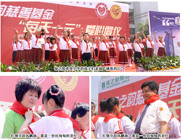 在“每天一元”慈善倡議活動現(xiàn)場,共青團長沙市委副書記詹萍萍為胡國安董事長頒發(fā)長沙市青少年發(fā)展基金會理事牌匾,并發(fā)表講話,充分肯定了綠之韻集團在發(fā)展企業(yè)的同時積極開展各類公益慈善活動的善舉。綠之韻集團董事常務(wù)副總裁勞嘉就今年山東和內(nèi)蒙古兩所希望小學向長沙市青少年發(fā)展基金會理事長羊舒麟遞交希望工程捐贈支票,羊舒麟理事長代表長沙市青少年發(fā)展基金會為綠之韻集團頒發(fā)希望工程貢獻單位獎牌匾?,F(xiàn)場,由綠之韻老屋希望小學的學生現(xiàn)場表演的手語歌舞《感恩的心》將現(xiàn)場氣氛推向高潮,希望小學的孩子們?yōu)樯綎|和內(nèi)蒙古兩地愛心經(jīng)銷商上臺佩戴紅領(lǐng)巾,愛心大使們給學生贈送精美的文具,愛心的芬芳充溢現(xiàn)場。綠之韻重教樂捐愛心代表申文高、王連坤現(xiàn)場進行了“感恩事業(yè) 回報社會”的分享,贏得現(xiàn)場陣陣充滿敬意的掌聲。
