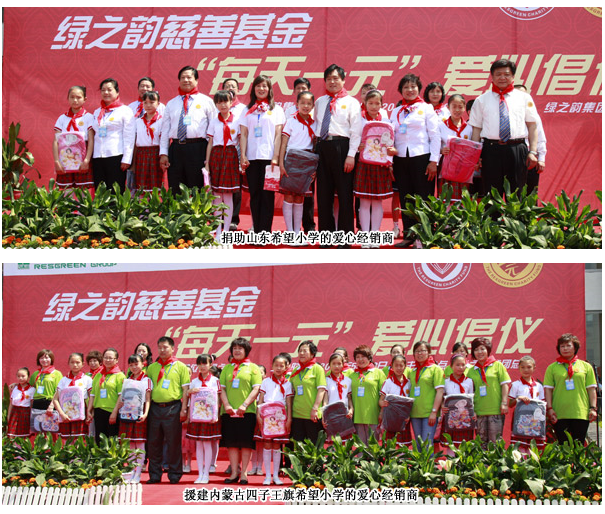 自2006年7月18日,綠之韻集團成立“綠之韻慈善基金”以來,積極面向社會實施慈善救助和開展公益活動,大力參與教育、關(guān)愛老人、賑災(zāi)、扶貧、幫困等社會慈善事業(yè),目前面向社會的慈善款物捐贈已達1000余萬元。2011年4月29日,綠之韻惠民梁家希望小學在山東惠民縣落成,6月2日綠之韻四子王旗希望小學又將在內(nèi)蒙古舉行捐贈儀式,萬涓成水,匯愛成海的綠之韻人將關(guān)愛生命,撒播愛心的理念溫情傳遞。
