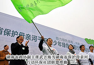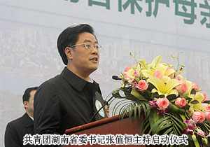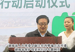 共青團(tuán)湖南省委書(shū)記張值恒主持儀式。啟動(dòng)儀式上,由大學(xué)生、中小學(xué)生、青年企業(yè)家、青年農(nóng)民、青年工人、青年科技人員組成的6個(gè)代表方陣,分別莊嚴(yán)地進(jìn)行了保護(hù)母親河綠色承諾。湖南省人民政府副秘書(shū)長(zhǎng)石華清為保護(hù)母親河行動(dòng)青少年生態(tài)監(jiān)護(hù)站和監(jiān)督崗授牌;湖南省委副秘書(shū)長(zhǎng)龔文密為汪涵、曾軼可、王櫟鑫等行動(dòng)公益大使頒發(fā)聘書(shū);湖南省政協(xié)副主席武吉海為環(huán)保社團(tuán)聯(lián)盟授旗;湖南省人大常委會(huì)副主任肖雅瑜點(diǎn)擊開(kāi)通湖南省保護(hù)母親河行動(dòng)專(zhuān)題網(wǎng)頁(yè)。儀式最后,汪涵等公益大使接過(guò)梅克保副書(shū)記授予的環(huán)保接力棒跑出會(huì)場(chǎng),拉開(kāi)了湖南省保護(hù)母親河環(huán)保接力活動(dòng)的序幕,隨后140名接力選手代表全省14個(gè)市州環(huán)繞橘洲公園先后接力。