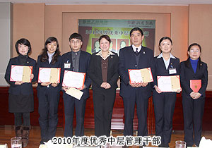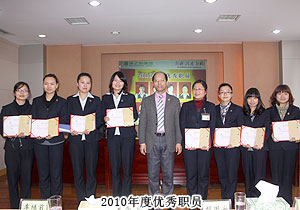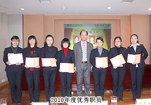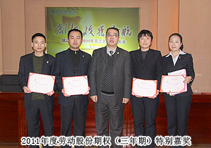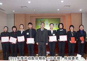 頒獎(jiǎng)典禮中,四季度服務(wù)明星、優(yōu)秀服務(wù)集體、年度優(yōu)秀職員、年度優(yōu)秀中層管理干部的表彰讓每一個(gè)員工感受到榮譽(yù)背后的忠誠(chéng)、敬業(yè)和專業(yè)。本次頒獎(jiǎng),一份得來(lái)不易的殊榮更讓員工們?yōu)閾碛芯G之韻的事業(yè)平臺(tái)而驕傲,為表彰鼓勵(lì)一直兢兢業(yè)業(yè),勤勤懇懇,愛司如家,對(duì)公司發(fā)展做出突出貢獻(xiàn)的優(yōu)秀員工,集團(tuán)特頒勞動(dòng)股份期權(quán)獎(jiǎng)。本次共有八名優(yōu)秀職員獲2011年度勞動(dòng)股份期權(quán)(五年期)特別嘉獎(jiǎng),四名優(yōu)秀職員獲2011年度勞動(dòng)股份期權(quán)(三年期)特別嘉獎(jiǎng)。胡國(guó)安董事長(zhǎng)親自為他們頒獎(jiǎng),并在總結(jié)發(fā)言中表示:或許你現(xiàn)在還離優(yōu)秀差一步,但只要你們?cè)倥Γ赂业叵騼?yōu)秀邁進(jìn),所有表現(xiàn)優(yōu)秀的職員都能在今后的努力中獲此殊榮。同時(shí),胡國(guó)安董事長(zhǎng)清晰地為員工們規(guī)劃職業(yè)生涯,讓綠之韻的每一位員工都能將才能最大化、價(jià)值最大化。