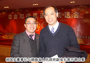 2011年1月5日,由湖南省委組織部、省委人才工作領(lǐng)導(dǎo)小組主辦、團省委承辦的2011年度湖南省會知識界迎春茶話會在蓉園賓館舉行。湖南省委常委、省委組織部部長、省委人才工作領(lǐng)導(dǎo)小組組長黃建國、湖南省人大常委副主任肖雅瑜等省領(lǐng)導(dǎo)和省會各界在湘知識界的院士、專家學(xué)者代表歡聚一堂、暢敘友情、互致問候、喜迎新春。茶話會由湖南省人民政府副省長郭開朗主持,綠之韻集團董事長胡國安作為榮獲湖南省人民政府一等功的湖南省優(yōu)秀青年企業(yè)家代表、省企業(yè)文化促進協(xié)會副會長應(yīng)邀出席,共話發(fā)展。