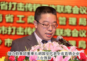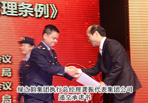 在這個莊嚴而隆重的舞臺上,以綠之韻集團董事長胡國安等為代表的直銷企業(yè)負責人向長沙市工商行政管理局黨組書記、局長陳躍文鄭重遞交守法經(jīng)營承諾書,寓示著各直銷企業(yè)嚴格自律、共同維護直銷秩序、堅決抵制傳銷的決心。胡國安董事長作為行業(yè)企業(yè)代表發(fā)言,他表示,作為一名企業(yè)公民,綠之韻一定遵循行業(yè)自律的市場規(guī)則,謀求與各直銷企業(yè)共同和諧發(fā)展,同時,作為一名企業(yè)公民,綠之韻也將在企業(yè)治理和道德價值、企業(yè)對人的責任、企業(yè)對環(huán)境的企業(yè)、企業(yè)發(fā)展中對社會的責任與貢獻等四個方面承擔起責任,認真學習貫徹兩個條例,嚴格遵守相關(guān)法律法規(guī),與傳銷劃清界限,以民族直銷企業(yè)為已任,與各直銷企業(yè)及社會各界朋友一起共創(chuàng)美好和諧未來。