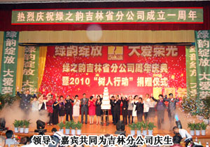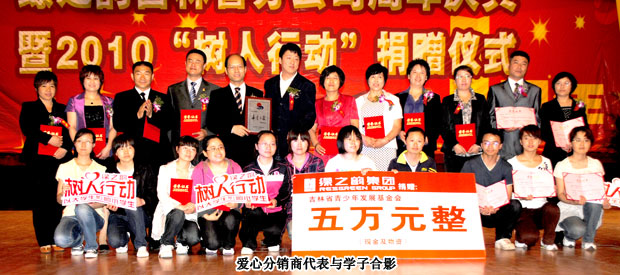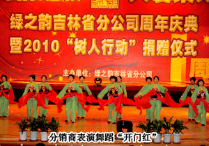 2010年5月29日,綠之韻吉林分公司喜迎“綠韻綻放?大愛(ài)榮光”一周年慶典暨“綠之韻樹(shù)人行動(dòng)”捐贈(zèng)儀式。綠之韻集團(tuán)執(zhí)行總經(jīng)理龔振、吉林分公司經(jīng)理劉曉桅與1000多名分銷精英共同為吉林分公司點(diǎn)亮生日蠟燭,歡樂(lè)慶生!同時(shí),吉林省青少年發(fā)展基金會(huì)部長(zhǎng)王超與東北師范大學(xué)10名品學(xué)兼優(yōu)的貧困學(xué)子列席會(huì)議,接受吉林分公司10名愛(ài)心分銷商5萬(wàn)元人民幣的愛(ài)心捐贈(zèng)。