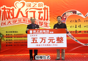 一年之計,莫如樹谷;十年之計,莫如樹木;終身之計,莫如樹人。2010年5月13日,“綠之韻樹人行動”全國第四站走進山東大學,現(xiàn)場舉行捐贈儀式,資助10名品學兼優(yōu)的貧困學生。綠之韻集團執(zhí)行總經(jīng)理龔振出席會議,代表綠之韻慈善基金向貧困學子首批捐助50000元愛心善款,山東大學黨委學生工作部部長曲明軍、副部長陳鑫代表校方接受捐贈。教育界、新聞界、文化界的相關(guān)領(lǐng)導與兩百余名大學生見證了綠之韻人又一次善舉。