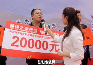 2010年4月28日,湖南省青工戰(zhàn)線抗震救災(zāi)捐款暨圖書義賣活動在湖南省圖書館舉行,共青團湖南省委副書記、湖南省青年企業(yè)家協(xié)會會長顏海林、湖南省出版物發(fā)行協(xié)會會長彭國華、湖南省青少年發(fā)展基金會常務(wù)副秘書長彭韜等相關(guān)省市領(lǐng)導(dǎo)出席。綠之韻集團董事長胡國安積極參與此次活動,并在現(xiàn)場以個人名義再次向玉樹災(zāi)區(qū)捐贈20000元現(xiàn)金。