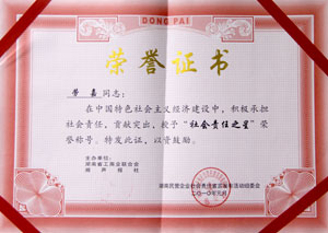 2010年1月21日,由湖南省工商業(yè)聯(lián)合會、省政協(xié)湘聲報社聯(lián)合主辦的湖南民營企業(yè)社會責任宣言發(fā)布活動在瀏陽舉行?;顒颖碚昧艘慌鷥?yōu)秀的民營企業(yè)在中國特色主義經(jīng)濟建設中積極承擔社會責任所作出的貢獻,綠之韻集團董事常務副總經(jīng)理勞嘉被授予“社會責任之星”榮譽稱號。