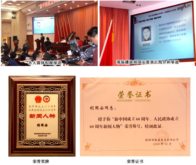 湖南省政協委員、綠之韻集團董事長胡國安被評選為“新中國成立60周年人民政協成立60周年新聞人物”,充分肯定了綠之韻集團和胡國安董事長在發(fā)展事業(yè)的同時,為社會進步所做的貢獻,為經濟發(fā)展所做出的重要成績。胡國安董事長因在國外學習而未能趕到現場,綠之韻集團董事長助理馬艷代表胡國安董事長出席現場領獎。胡國安董事長表示,綠之韻集團將以更成熟穩(wěn)健的步伐邁向更寬廣的發(fā)展之路,以更強的責任感去擔當社會發(fā)展中的使命。同時獲此殊榮的還有 “雜交水稻之父”袁隆平;中國工程院院士、湖南大學校長鐘志華等。