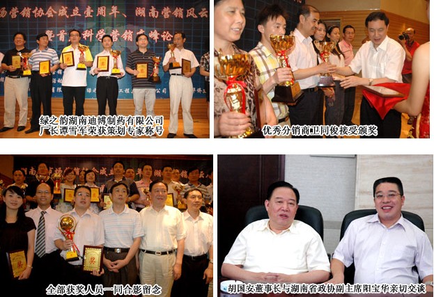 2009年6月23日上午,胡國安董事長應(yīng)邀出席在湖南省委蓉園賓館隆重舉行的“湖南省市場營銷協(xié)會成立周年慶典暨湖南營銷風(fēng)云人物頒獎典禮”活動,并榮獲“2008—2009年度湖南省十大營銷風(fēng)云人物”稱號,此外,綠之韻集團執(zhí)行總經(jīng)理龔振榮獲“湖南十大營銷團隊建設(shè)專家”稱號、董事長助理馬艷榮獲“湖南十大營銷管理專家”稱號,綠之韻湖南迪博制藥有限公司廠長譚雪軍榮獲“湖南十大營銷策劃專家”稱號、優(yōu)秀分銷商衛(wèi)同俊榮獲“湖南十大營銷團隊建設(shè)專家”稱號,再一次向社會各界展示了綠之韻集團雄厚的管理實力。