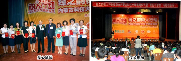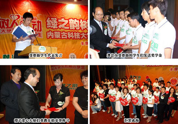 繼首站在吉林東北師范大學(xué)舉行了樹人行動(dòng)獎(jiǎng)學(xué)金的發(fā)放儀式后,綠之韻慈善基金預(yù)計(jì)總投入1000萬開展的“綠之韻樹人行動(dòng)”愛心圣火又在內(nèi)蒙古點(diǎn)燃。