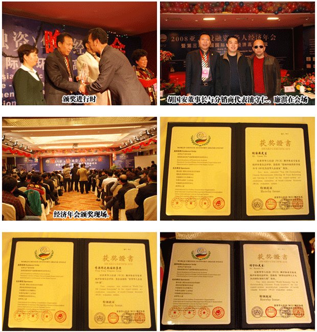 綠之韻集團(tuán)胡國安董事長受邀全程出席此次會議,綠之韻集團(tuán)榮獲“世界華人企業(yè)500強”榮譽大獎,胡國安董事長個人被評為“影響中國改革開放30年100位杰出華人企業(yè)家”, 全國工商聯(lián)副主席孫曉華為胡國安董事長頒獎; 綠之韻分銷商管理委員會會長浦守仁獲“2008年世界經(jīng)濟(jì)華人十大杰出團(tuán)隊領(lǐng)導(dǎo)人獎”。