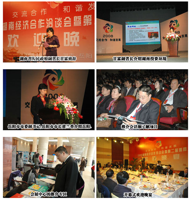 四水匯洞庭,萬(wàn)商聚巴陵。2008年10月27~29日,湖南經(jīng)濟(jì)合作洽談會(huì)暨第二屆湘商大會(huì)在巴陵古城岳陽(yáng)隆重召開,來(lái)自全國(guó)各地的黨政代表團(tuán)、國(guó)內(nèi)知名企業(yè)團(tuán)、異地商會(huì)團(tuán)、科研院所團(tuán)、港澳臺(tái)團(tuán)等共72個(gè)代表團(tuán)3000多人參與了此次大會(huì)。綠之韻集團(tuán)胡國(guó)安董事長(zhǎng)作為湖南省工商聯(lián)常委、中國(guó)青年企業(yè)家協(xié)會(huì)會(huì)員,湖南知名企業(yè)代表受邀全程出席此次會(huì)議,帶領(lǐng)董事長(zhǎng)助理馬艷等一行前往洽談合作項(xiàng)目。