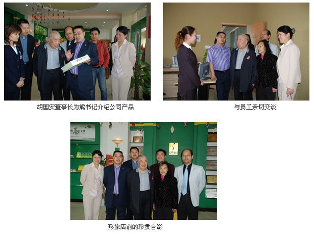 2007年4月15日,原湖南省委書(shū)記熊清泉攜其夫人蒞臨綠之韻集團(tuán)考察指導(dǎo)工作?!吧菩?007、三湘助學(xué)行”香港明星足球隊(duì)(長(zhǎng)沙)大型公益義演賽組委會(huì)總顧問(wèn)、綠之韻集團(tuán)董事長(zhǎng)兼總裁胡國(guó)安先生,綠之韻集團(tuán)董事、執(zhí)行總經(jīng)理陳社行先生,董事、常務(wù)副總經(jīng)理勞嘉女士,綠之韻國(guó)際集團(tuán)(東南亞)股份有限公司執(zhí)行總經(jīng)理龔振先生對(duì)老書(shū)記的到來(lái)表示了最熱烈的歡迎。并親自陪同老領(lǐng)導(dǎo)進(jìn)行了詳細(xì)實(shí)察。