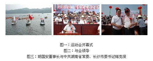 仲秋喜盼豐收日,盛世歡慶國慶時。2006年9月22日上午,由長沙市市委、長沙市人民政府主辦,綠之韻公司出資協(xié)辦的“長沙市第一屆農(nóng)民運動會龍舟賽”在風光秀美的瀏陽赤馬湖隆重開幕。湖南省常委、長沙市委書記梅克保、長沙市委巡視員、市人大黨組第一副書記余合泉、長沙市市委副書記吳志雄、長沙市市委秘書長張湘濤、長沙市人大副主任劉耀杰、長沙市人民政府副市長曹亞、長沙市政協(xié)副主席柳冠群、市政協(xié)副主席姚五零、瀏陽市委書記易佳良、綠之韻集團董事長兼總裁胡國安先生與省市領(lǐng)導共同出席了第一屆農(nóng)民運動會開幕式。