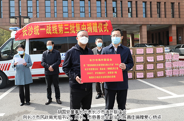 2020年3月18日,長(zhǎng)沙市統(tǒng)一戰(zhàn)線第三批集中捐贈(zèng)儀式在長(zhǎng)沙市慈善基金會(huì)前坪舉行。中共長(zhǎng)沙市委常委、市委統(tǒng)戰(zhàn)部部長(zhǎng)譚小平,長(zhǎng)沙市民政局黨組書記、局長(zhǎng)、市慈善總會(huì)副會(huì)長(zhǎng)陳昌佳,中共長(zhǎng)沙市委統(tǒng)戰(zhàn)部常務(wù)副部長(zhǎng)劉映群,中共長(zhǎng)沙市委統(tǒng)戰(zhàn)部副部長(zhǎng)、長(zhǎng)沙市僑聯(lián)黨組書記王國(guó)平等領(lǐng)導(dǎo)出席活動(dòng),市委統(tǒng)戰(zhàn)部、市民政局、市民宗局、市慈善總會(huì)有關(guān)負(fù)責(zé)同志,各民主黨派市委負(fù)責(zé)同志,市黨外知識(shí)分子聯(lián)誼會(huì)負(fù)責(zé)同志,市宗教界代表人士,市海外聯(lián)誼會(huì)、香港長(zhǎng)沙聯(lián)誼會(huì)代表人士參加活動(dòng)。湖南省政協(xié)委員、長(zhǎng)沙市海外聯(lián)誼會(huì)副會(huì)長(zhǎng)、綠之韻集團(tuán)董事長(zhǎng)胡國(guó)安受邀參加活動(dòng)。