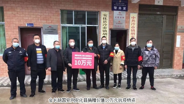自疫情爆發(fā),安化縣經(jīng)促會(huì)長(zhǎng)沙分會(huì)、長(zhǎng)沙市安化商會(huì)密切關(guān)注安化縣疫情發(fā)展,得知安化縣緊缺醫(yī)療防護(hù)物資,會(huì)長(zhǎng)胡國(guó)安、執(zhí)行會(huì)長(zhǎng)夏曉輝、常務(wù)副會(huì)長(zhǎng)兼輪值會(huì)長(zhǎng)吳余生等領(lǐng)導(dǎo)快速反應(yīng),積極作為,部署秘書處發(fā)動(dòng)會(huì)員支援安化。1月30日,安化縣經(jīng)促會(huì)長(zhǎng)沙分會(huì)、長(zhǎng)沙市安化商會(huì)向會(huì)員企業(yè)發(fā)起“支援安化抗擊疫情”的專項(xiàng)募捐活動(dòng),倡議各安商積極行動(dòng),支援安化,萬眾一心,抗擊疫情。倡議發(fā)出后,會(huì)員們積極響應(yīng),紛紛慷慨解囊,奉獻(xiàn)愛心,更有部分會(huì)員排除萬難,親自護(hù)送物資前往安化,以解安化燃眉之急。2月1日,會(huì)長(zhǎng)胡國(guó)安捐贈(zèng)價(jià)值10萬元的韓國(guó)KF口罩、醫(yī)用外科口罩、消毒液、洗護(hù)用品等醫(yī)療抗疫物資并親自護(hù)送至安化。