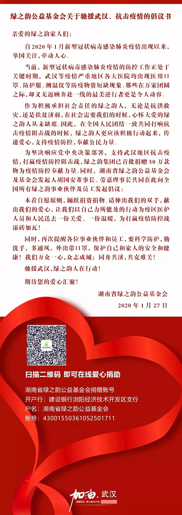 ▲1月29日,綠之韻碧波庭事業(yè)伙伴通過(guò)上海慈善基金會(huì)向湖北武漢等疫情嚴(yán)重的地方捐贈(zèng)30萬(wàn)元。1月30日,通過(guò)湖南省綠之韻公益基金會(huì)追加10萬(wàn)元捐款。