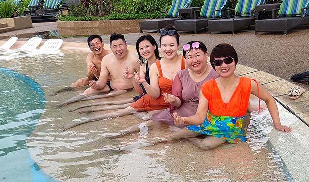 馬穆迪島,是東姑阿都拉曼海島公園群島中規(guī)模最小的一個(gè)島嶼,被譽(yù)為“潛水者的天堂”,因其海水清澈見(jiàn)底,水下動(dòng)植物品種豐富而聞名。在這熱情的海島上,有細(xì)白的沙灘以及完全沒(méi)有污染的天然景色,家人們可以享受清澈見(jiàn)底的海水,感受細(xì)膩的白沙從指縫間劃過(guò)。雖然綠之韻家人們上島時(shí)適逢天下大雨,海上項(xiàng)目都只能取消。但在迷蒙的煙雨中,家人們或是聚在一塊交流旅游心得、所見(jiàn)所聞,或是三五成群為第二天的晚宴進(jìn)行籌備,或是坐在廊下,觀賞著雨幕下的馬穆迪,亦是別有一番風(fēng)味。