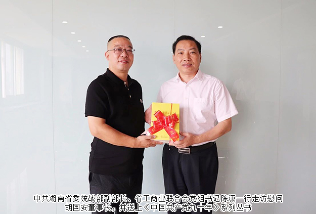 為迎接即將到來的70周年祖國華誕,9月25日下午,中共湖南省委統(tǒng)戰(zhàn)部副部長(zhǎng)、省工商業(yè)聯(lián)合會(huì)黨組書記陳瀟一行走訪慰問“第四屆全國優(yōu)秀中國特色社會(huì)主義事業(yè)建設(shè)者”胡國安董事長(zhǎng),為胡國安董事長(zhǎng)送來鮮花與《中國共產(chǎn)黨九十年》系列叢書,對(duì)胡國安董事長(zhǎng)一直以來支持統(tǒng)一戰(zhàn)線工作、為湖南社會(huì)經(jīng)濟(jì)發(fā)展作貢獻(xiàn)表示感謝并送上節(jié)日的祝福。