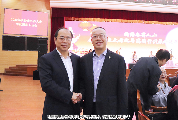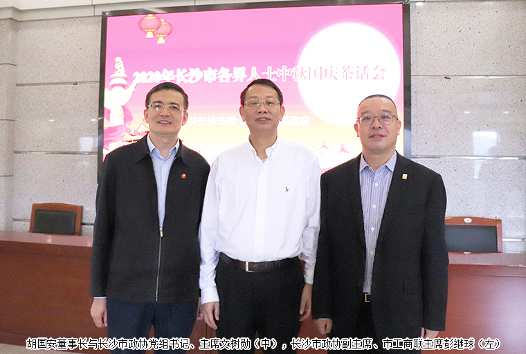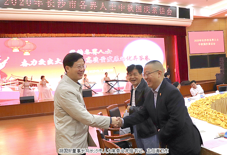2020年9月28日,由中共長(zhǎng)沙市委、長(zhǎng)沙市政府主辦的2020年長(zhǎng)沙市各界人士中秋國(guó)慶茶話會(huì)在長(zhǎng)沙市會(huì)議中心召開。中共湖南省委常委、長(zhǎng)沙市委書記胡衡華,長(zhǎng)沙市人大常委會(huì)黨組書記、主任謝衛(wèi)東,長(zhǎng)沙市政協(xié)黨組書記、主席文樹勛,中共長(zhǎng)沙市委常委、統(tǒng)戰(zhàn)部部長(zhǎng)譚小平以及全市離退休老同志、各界人士共同出席活動(dòng)。湖南省政協(xié)委員、香港長(zhǎng)沙聯(lián)誼會(huì)名譽(yù)會(huì)長(zhǎng)、香港長(zhǎng)沙商會(huì)常務(wù)副會(huì)長(zhǎng)、綠之韻集團(tuán)董事長(zhǎng)胡國(guó)安受邀出席活動(dòng),與參會(huì)嘉賓歡聚一堂,共敘友情、共謀發(fā)展,共慶中秋佳節(jié)和中華人民共和國(guó)成立71周年。
