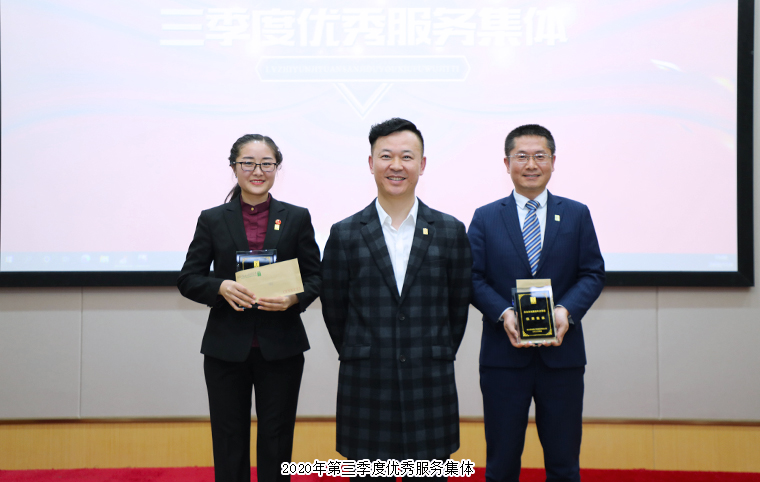 為表彰先進(jìn)、凝聚力量,進(jìn)一步激勵全體員工的積極性和奮斗激情,大會集中頒發(fā)了“三季度優(yōu)秀服務(wù)集體”“三季度服務(wù)明星”“五年服務(wù)英才獎”“十年服務(wù)忠誠獎”等獎項(xiàng)。傭金結(jié)算中心、新聞信息中心榮獲“2020年第三季度優(yōu)秀服務(wù)集體”稱號,喻鳴鸞、靳威、楊邢軒、李向宇、王雪、牛小紅、戴明玉、林智文、李思、夏丹、劉偉、李克戰(zhàn)、戴明勇、蘇銅、肖巧林被評為“2020年第三季度星級優(yōu)秀員工”,綠之韻集團(tuán)副總裁劉淑娟、總經(jīng)理劉維利為獲獎部門代表及個人頒獎。肖波、曾夢繁、朱麗妍、張婭、蘇妍、陳苗、張煜軒、劉博、吳冬梅、李星麗、牛小紅、孟慶玲、袁新星、張琳、鄧金林、劉伏海榮膺“五年服務(wù)英才獎”,張曉芳、周金霖、盛夏、高素丹、彭姣、高芳榮膺“十年服務(wù)忠誠獎”,綠之韻集團(tuán)董事總裁勞嘉、副總裁胡均安先后上臺為獲獎員工頒發(fā)獎?wù)屡c榮譽(yù)證書,并致以熱烈祝賀。“五年服務(wù)英才獎”代表肖波和“十年服務(wù)忠誠獎”代表周金霖分別發(fā)表獲獎感言。