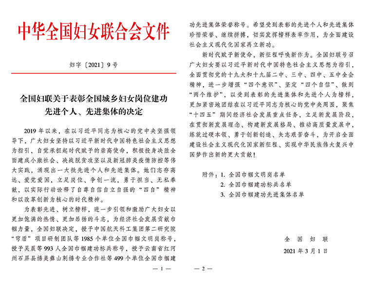 巾幗心向黨,百年正芳華。在建設(shè)新時(shí)代中國(guó)特色社會(huì)主義事業(yè)的偉大征程上,女性為經(jīng)濟(jì)社會(huì)發(fā)展貢獻(xiàn)出不可磨滅的巾幗力量。日前,為表彰先進(jìn)、樹(shù)立榜樣,進(jìn)一步引領(lǐng)和激勵(lì)廣大婦女以更加飽滿的熱情、更加昂揚(yáng)的斗志,為經(jīng)濟(jì)社會(huì)發(fā)展貢獻(xiàn)力量,中華全國(guó)婦女聯(lián)合會(huì)下發(fā)《關(guān)于表彰全國(guó)城鄉(xiāng)婦女崗位建功先進(jìn)個(gè)人、先進(jìn)集體的決定》。其中,綠之韻集團(tuán)獲評(píng)“全國(guó)巾幗文明崗”稱號(hào)。