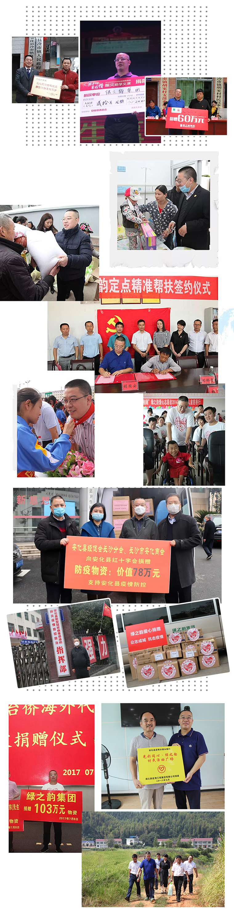 早在2006年,綠之韻便設(shè)立了“綠之韻慈善基金”,2015年獲省民政廳批準升級為湖南省“綠之韻公益基金會”。并積極與中華慈善總會、湖南省慈善總會、湖南省長沙市光彩事業(yè)基金會、長沙市青少年發(fā)展基金會、國際關(guān)心中國慈善協(xié)會(ICC)等機構(gòu)緊密合作,大力推進公益扶貧項目,建立常規(guī)化公益援助機制。截止目前,綠之韻集團已經(jīng)累計捐建了11所希望學(xué)校,踴躍參與和捐助了100多項品牌公益慈善項目,項目涉及賑災(zāi)濟困、興教助學(xué)、孤殘救助、醫(yī)療衛(wèi)生、修路飲水、養(yǎng)老醫(yī)療等多個領(lǐng)域,累計捐款捐物7000多萬元。除了大力參與賑災(zāi)、抗疫、扶貧、幫困等社會慈善事業(yè)之外,還積極開展關(guān)愛貧困母親、綠韻圓夢書香助學(xué)、關(guān)愛孤殘兒童、“綠跑”大型公益計劃等具有綠之韻品牌和社會影響力的公益活動。