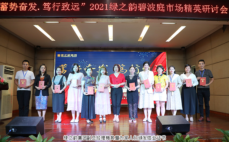 除了產(chǎn)品課程分享之外,各行業(yè)領(lǐng)域的大咖也帶來了精彩的專業(yè)知識培訓(xùn)。6月17日,大型紀(jì)錄片《曾國藩》導(dǎo)演、湖南電視臺制片人曾海波作《聽過曾國藩,從此不平凡》主題演講。同時(shí),店鋪管理及業(yè)務(wù)流程、市場案例分析等專業(yè)課程的分享,都讓在座的綠之韻家人們收獲頗豐。培訓(xùn)臨近結(jié)束,綠之韻集團(tuán)副總經(jīng)理梅其慧作總結(jié)發(fā)言并頒發(fā)結(jié)業(yè)證書。她表示,此次研討會精心安排內(nèi)容豐富的培訓(xùn)課程,是希望大家能學(xué)有所感、學(xué)有所悟、學(xué)有所用,通過系統(tǒng)學(xué)習(xí),把今天“學(xué)”到的內(nèi)容“習(xí)”到明天的市場活動(dòng)當(dāng)中。未來集團(tuán)公司和碧波庭也一定會繼續(xù)給予各位市場伙伴全方位的支持與幫助,全力為大家打造更優(yōu)質(zhì)的事業(yè)平臺,同心同德同行,為實(shí)現(xiàn)偉大的綠之韻碧波庭健康事業(yè)而努力奮斗。她相信,在大家的不懈努力下,綠之韻碧波庭的未來一定美好可期 。