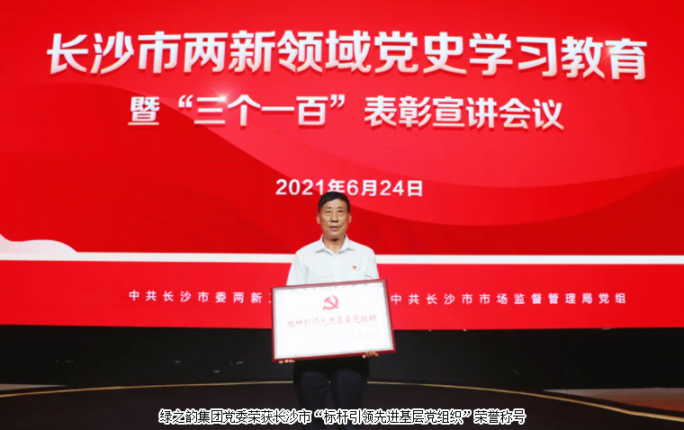 2021年6月24日,長沙市兩新領(lǐng)域黨史學(xué)習(xí)教育暨“三個(gè)一百”表彰宣講會(huì)召開。中共長沙市委常委、市委組織部部長張宏益,市政協(xié)副主席、民盟市委主委、市市場(chǎng)監(jiān)督管理局局長張慶和,中共長沙市委組織部副部長、兩新工委書記、基層辦主任楊俊,市民政局黨委書記、局長、市委兩新工委副書記陳昌佳,市市場(chǎng)監(jiān)督局黨組書記、市委兩新工委副書記邱山東,市委兩新工委專職副書記肖劍鋒等領(lǐng)導(dǎo)出席會(huì)議。綠之韻集團(tuán)黨委副書記許達(dá)仲參加會(huì)議。會(huì)上,綠之韻集團(tuán)黨委榮獲長沙市“標(biāo)桿引領(lǐng)先進(jìn)基層黨組織”榮譽(yù)稱號(hào)。
