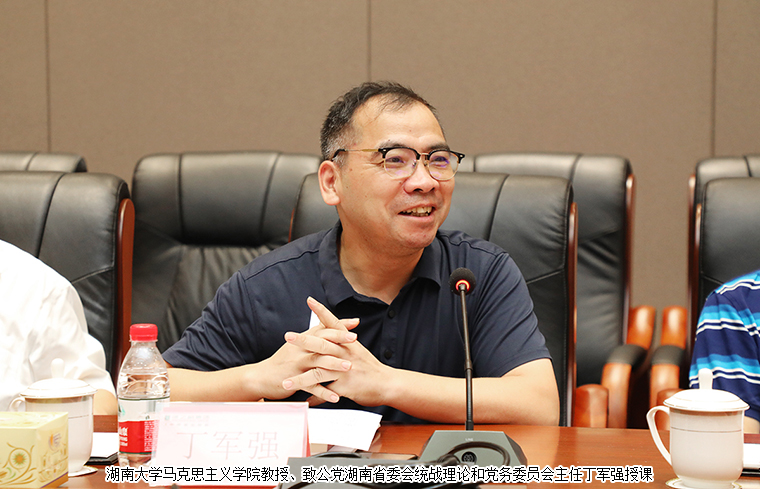 調(diào)研期間,湖南大學(xué)馬克思主義學(xué)院教授、致公黨湖南省委會(huì)統(tǒng)戰(zhàn)理論和黨務(wù)委員會(huì)主任丁軍強(qiáng)教授以《百年中共的歷史經(jīng)驗(yàn)與實(shí)踐開(kāi)拓》為題現(xiàn)場(chǎng)授課,分別從“百年中共的歷史進(jìn)程與歷史經(jīng)驗(yàn)”、“面向未來(lái)的理論創(chuàng)新與開(kāi)拓創(chuàng)新”、“知史閱世的重大意義與學(xué)思悟踐”三個(gè)方面深層次解讀中國(guó)共產(chǎn)黨波瀾壯闊的百年黨史,并結(jié)合習(xí)近平總書(shū)記在慶祝中國(guó)共產(chǎn)黨成立100周年大會(huì)上的重要講話(huà)深入分析,深刻詮釋了中國(guó)共產(chǎn)黨為什么“能”、馬克思主義為什么“行”、中國(guó)特色社會(huì)主義為什么“好”,進(jìn)一步領(lǐng)會(huì)中國(guó)共產(chǎn)黨先進(jìn)的政治屬性、崇高的政治理想、高尚的政治追求、純潔的政治品質(zhì)。