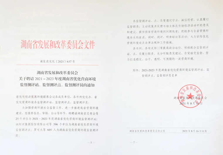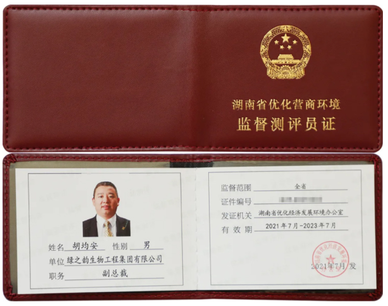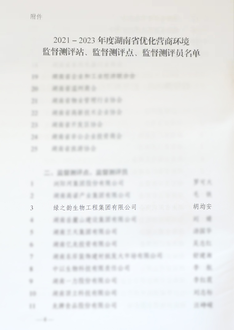 為加強(qiáng)營商環(huán)境社會監(jiān)督工作,進(jìn)一步推進(jìn)我省營商環(huán)境建設(shè),經(jīng)企業(yè)申請和單位推薦報(bào)名,通過相關(guān)部門審核和公示公開,經(jīng)湖南省優(yōu)化經(jīng)濟(jì)發(fā)展環(huán)境聯(lián)席會議辦公室研究,綠之韻集團(tuán)獲評“2021-2023年度湖南省優(yōu)化營商環(huán)境監(jiān)督測評點(diǎn)”,綠之韻集團(tuán)副總裁胡均安獲評“湖南省優(yōu)化營商環(huán)境監(jiān)督測評員”。