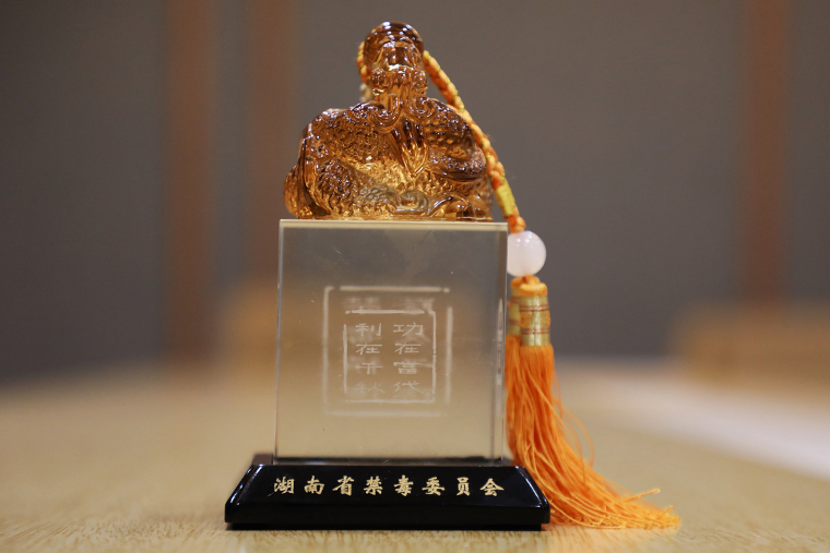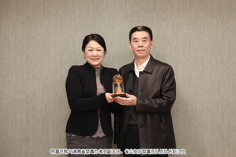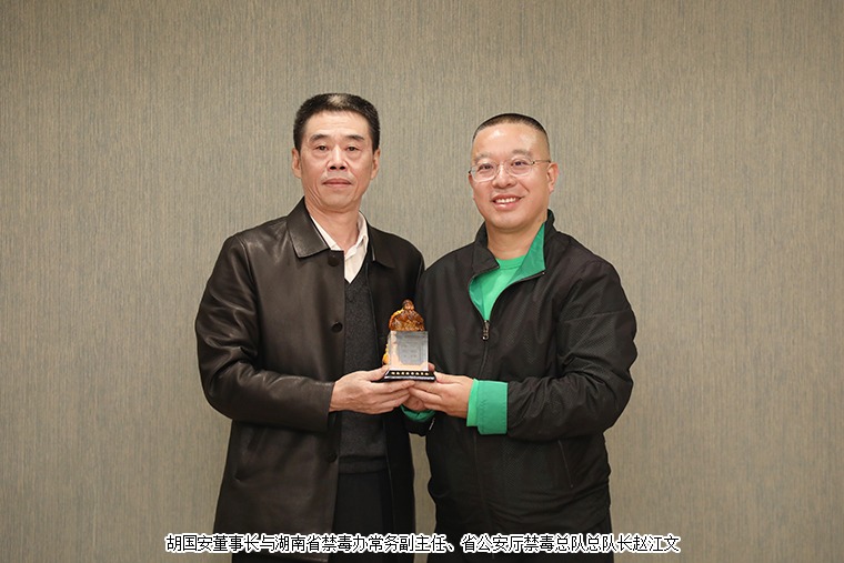 2021年10月28日,湖南省禁毒辦常務(wù)副主任、省公安廳禁毒總隊總隊長趙江文,省禁毒協(xié)會會長董瑛,省禁毒辦副主任、省公安廳禁毒總隊副總隊長李鵬飛,省公安廳禁毒總隊預(yù)防教育支隊支隊長彭國清等一行蒞臨綠之韻集團(tuán)進(jìn)行禁毒工作交流并舉行“湖南省禁毒協(xié)會副會長單位”授牌儀式。綠之韻集團(tuán)董事長胡國安,綠之韻公益基金會理事長、綠之韻集團(tuán)董事總裁勞嘉,綠之韻公益基金會秘書長蔣文參與本次工作交流會。