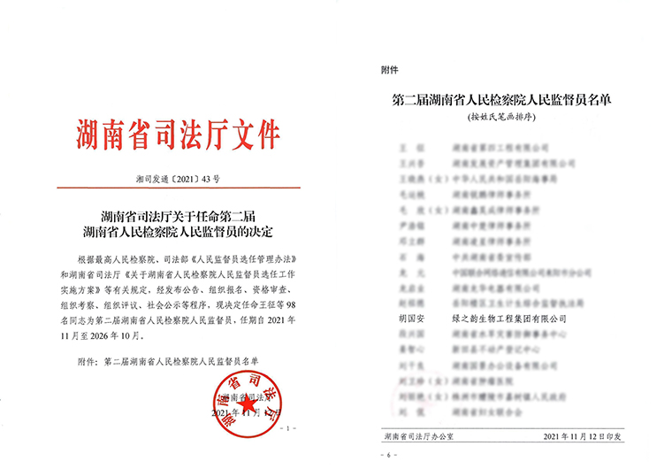 2021年11月18日,第二屆湖南省人民檢察院人民監(jiān)督員任職宣誓暨初任培訓(xùn)會(huì)議在長(zhǎng)沙召開(kāi)。湖南省司法廳黨組書(shū)記、廳長(zhǎng)范運(yùn)田,省人民檢察院副檢察長(zhǎng)印仕柏出席會(huì)議并講話,省司法廳黨組成員、政治部主任雷豐超宣讀任命決定,省司法廳黨組成員、副廳長(zhǎng)胡國(guó)雄主持會(huì)議。第二屆省人民檢察院人民監(jiān)督員,各市州人民檢察院案件管理辦公室負(fù)責(zé)人,各市州人民監(jiān)督員選任管理辦公室負(fù)責(zé)人,省人民檢察院案件管理辦公室全體人員,省人民監(jiān)督員選任管理辦公室全體人員參加會(huì)議。湖南省政協(xié)委員、省工商聯(lián)(總商會(huì))副會(huì)長(zhǎng)、綠之韻集團(tuán)董事長(zhǎng)胡國(guó)安參加會(huì)議。